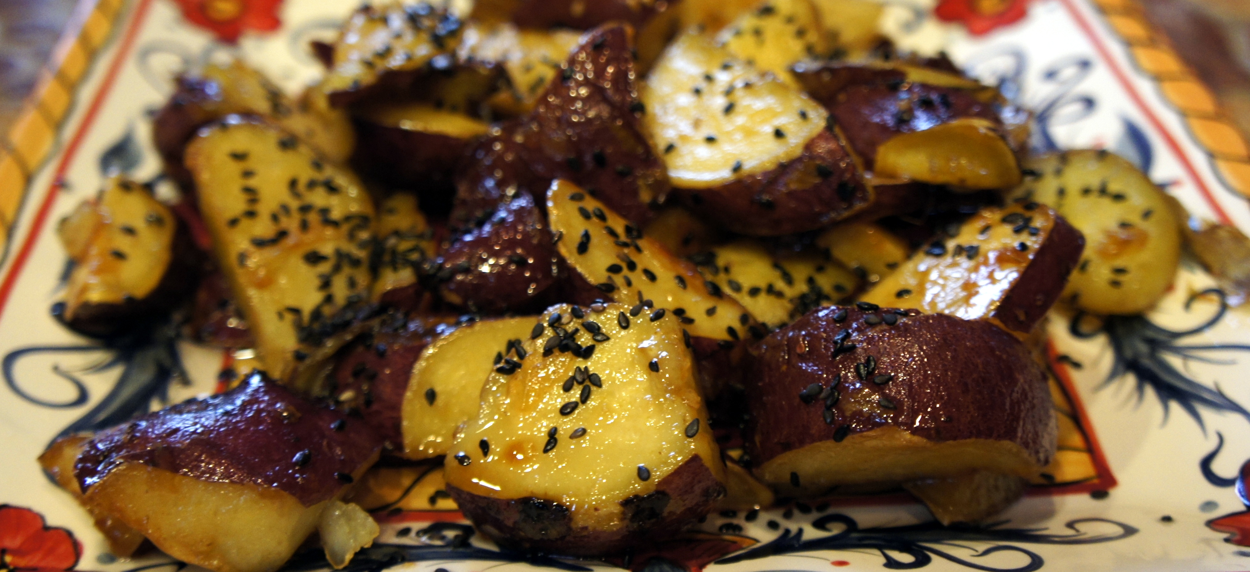 Step 2: Add the potatoes to the pan and cover Step 3: With cover on shake the pan to coat the potatoes with the sugar mixture Step 4: Open the lid and pour soy sauce, continue to cook the potatoes uncovered, mixing it a bit so they don’t stick to the pan Step 5: Remove from heat, place in a serving dish and sprinkle with sesame seeds