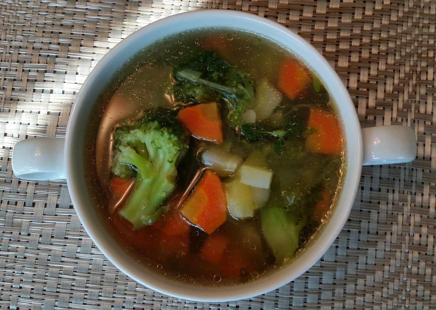 Spinach broth (add spinach to boiled water for about a minute), 3 green onions, 2 carrots, small crown of broccoli, 1 clove of garlic, 2/3 cups of barley for 6 cups of liquid. Herbs (any i used fresh thyme and sage from our garden), 1tb olive oil, salt and pepper to taste.