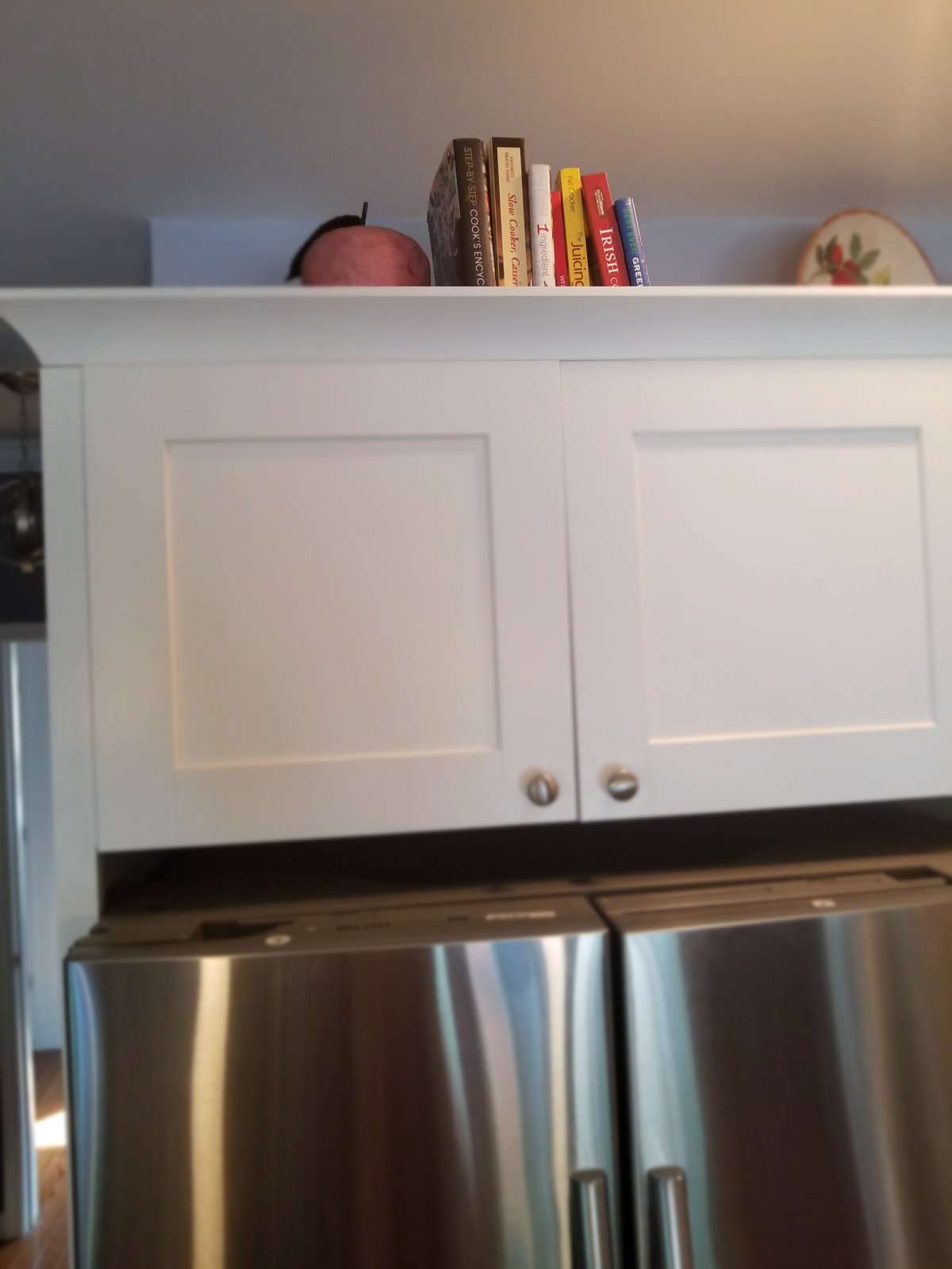 Another set of books we moved to the top of the cabinet, propelled by a heavy bookend. Ours looks like a large red apple, appropriate to our kitchen decor.