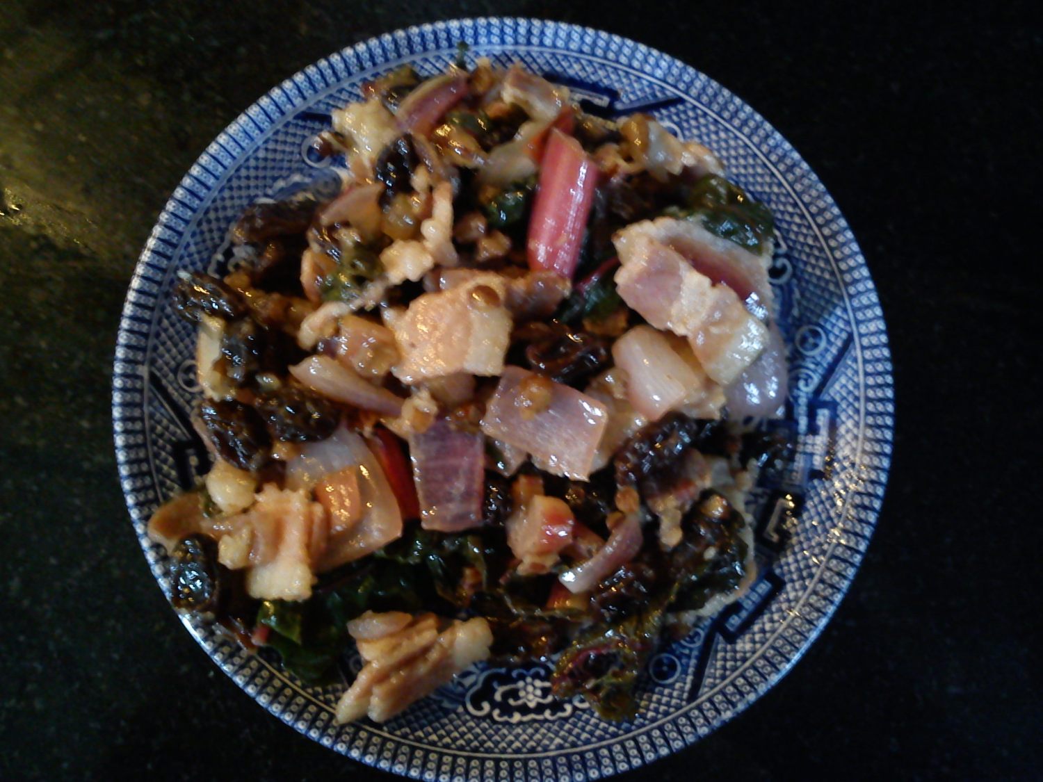 | Recipe | Step 1: Sautee bacon, onion and chard leaf stems on a frying pan over medium heat